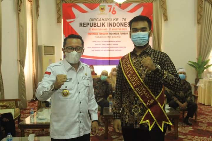 Bupati Tanah Datar Eka Putra menyampaikan apresiasi dan ucapan selamatnya saat bertemu dengan Aulia Alfarizi di Indojolito Batusangkar, Rabu (18/8/2021), menyampaikan apresiasi dan selamat atas keberhasilannya melaju ke grand final Ajang Duta Pemuda Kebudayaan di Provinsi Jambi.