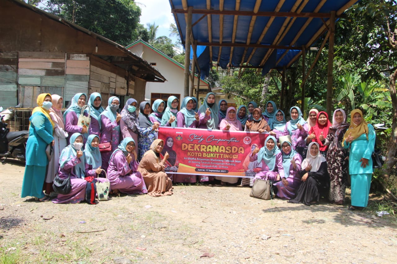 Bukittinggi, siberindo.co — Pengurus Dewan Kerajinan Nasional Daerah (Dekranasda) Kota Bukittinggi yang dipimpin langsung oleh Ketua Dekranasda Ny.Fiona Erman Safar studi comparative ke Usaha Anyaman Kombuik Mansiang Labuan Jaya di Jorong Taratak Kenagarian Kubang Kecamatan Guguak Kabupaten 50 Kota, Jumat (17/09). Rombongan yang juga diikuti oleh Wakil Ketua Dekranasda Bukittinggi Ny. Eva Marfendi, Sekretaris Tati Yasmarni, serta ketua bidang dan pengurus lainnya tersebut disambut hangat oleh Camat Guguak, yang diwakili oleh Sekretaris Kecamatan, Suhardi bersama TP PKK Kecamatan, Walinagari Kubang Zulefdi, Kepala Jorong Taratak dan perangkatnya serta masyarakat Jorong Taratak. Sekretaris Kecamatan Guguak, Suhardi, mengaku senang dan gembira dikunjungi langsung oleh istri Walikota Bukittinggi dan berharap dari kunjungan tersebut akan menghasilkan kerjasama yang baik kedepannya.