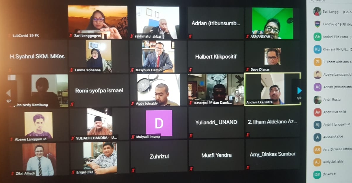 Acara zoom meeting ini dimoderatori Doktor Sari Lenggogeni dari Kawal Covid-19 Sumbar dengan peserta Wakil Gubernur Sumbar Audy Joinaldi, Wako Padang Hendri Septa, Direktur RS Djamil Dovy Djanas, Rektor Unand Yuliandri, Ketua IJTI Sumbar Jhonedy Kambang, Ketua SMSI Sumbar Zulnadi, Kepala Satpol PP Sumbar Edi Diantolani, puluhan wartawan senior, sejumlah aktifis, pengajar PT dan pengamat.