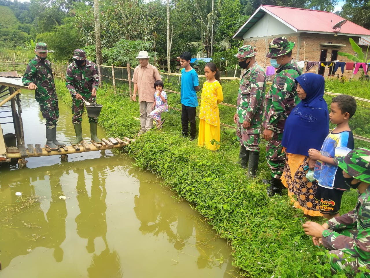 LIMAPULUH KOTA, Siberindo-Anggota Satgas TMMD/N ke 111 tahun 2021 Kodim 0306/50 Kota, Sumatera Barat Sabtu (19/6/2021) melakukan Komunikasi Sosial (Komsos) bersama Endrizal pemilik kolam ikan nila di Nagari Talang Maur, Kecamatan Mungka.