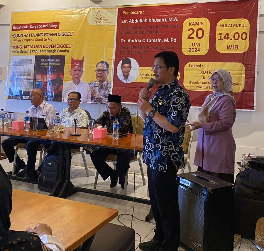 Kepala Dinas Kebudayaan Sumbar Jefrinal Arifin diwakili Sekretaris Dinas Kebudayaan Sumbar, Yayat Wahyudi A. ST, M.Si, yang membuka acara bedah buku tersebut mengatakan, bedah buku merupakan kerja-kerja yang cerdas. Sehingga kegiatan ini perlu dicontoh untuk meningkatkan literasi dan ilmu pengetahuan.