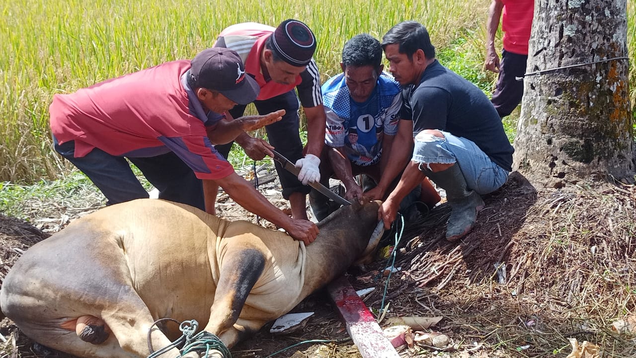 Pantauan KABA12.com dilokasi, penyembelihan hewan kurban dilaksanakan di ruang terbuka disekitar masjid, sedangkan pemotongan daging dilakukan di halaman masjid setempat.