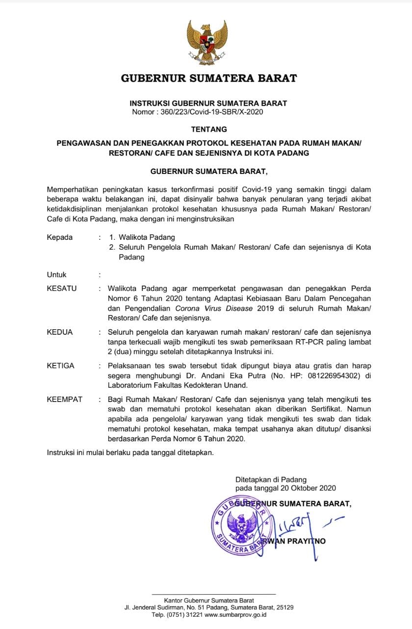 Aturan ini tertuang dalam Instruksi Gubernur Sumatera Barat Nomor 360/223/Covid-19-SBR/X-2020 tanggal 20 Oktober 2020 tentang penegakan dan pengawasan protokol kesehatan pada rumah makan/restoran/cafe dan sejenisnya di Kota Padang.
