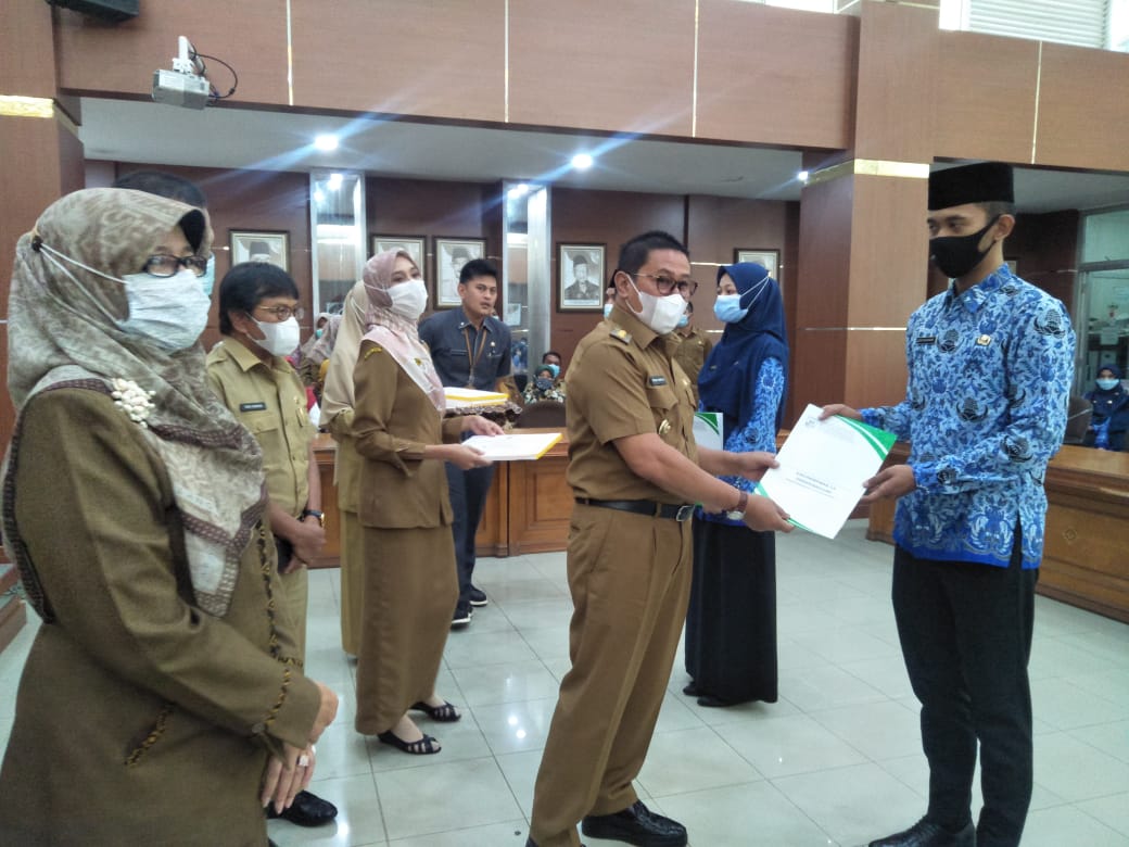 Mereka yang lulus formasi tahun 2019, hari ini, Senin (21/12/2020) menerima SK CPNS. SK diserahkan oleh Wali Kota, Ramlan Nurmatias, di aula Balaikota Bukittinggi.