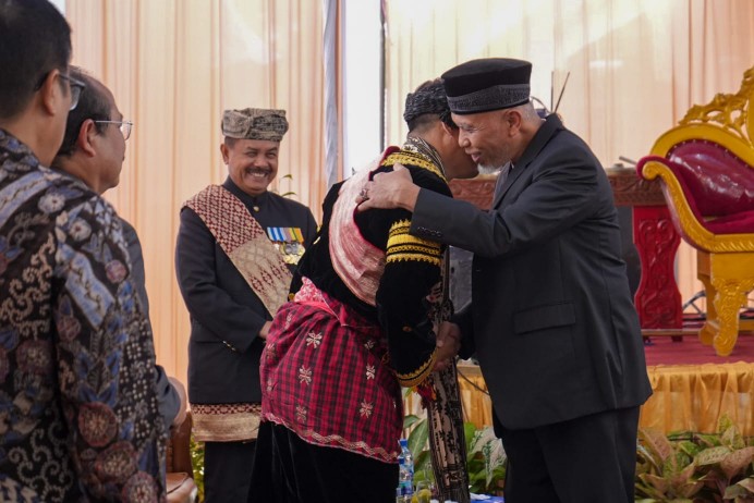 Gubernur Sumatera Barat Mahyeldi Dt. Maradjo dan Ketum Lembaga Kerapatan Adat Alam Minangkabau (LKAAM) Sumbar Dr. Fauzi Bahar, M.Si Datuak Nan Sati menghadiri langsung acara malewakan penghulu adat Kolonel Laut Ade Prasetia S., M.Si (Han) M.Tr dengan gelar Datuak Panduko Marajo di Jorong Padang Ambacang, Nagari Situjuah Banda Dalam, Kabupaten Limapuluh Kota, Sabtu (21/1/2023).