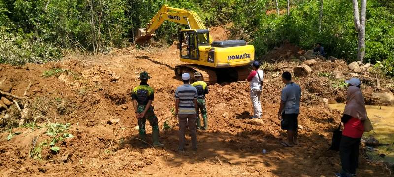 Terlihat pengawas dilapangan Mayor Inf. Irwan Taufik sedang mengarahkan Operator yang sedang bekerja dan beberapa anggota Kodim 0308/Pariaman serta warga setempat ikut berpartisipasi dalam pembukaan jalan di Korong Lipek Pageh.