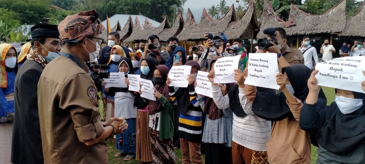 Di kesempatan itu, Sandiaga didampingi Wali Kota Fadly Amran dan sejumlah pimpinan OPD lingkup Pemko. Kehadiran Sandiaga di lokasi, disambut tokoh masyarakat setempat. J Dt Sati salah seorang pemuka masyarakat, menyempatkan diri pasangkan deta ke kepala Sandiaga sebagai penghormatan manakala Sandi masuki kawasan Wisata Kubu Gadang. Tidak itu saja, kedatangan Sandi telah dua kali ke Kubu Gadang juga disambut tarian siriah dicarano dan lambaian bendera selamat datang dari siswa TK dan SD. “Selamat datang pak Mentri” sorak puluhan siswa, seperti dilansir minangsatu.com jejaring siberindo.co.