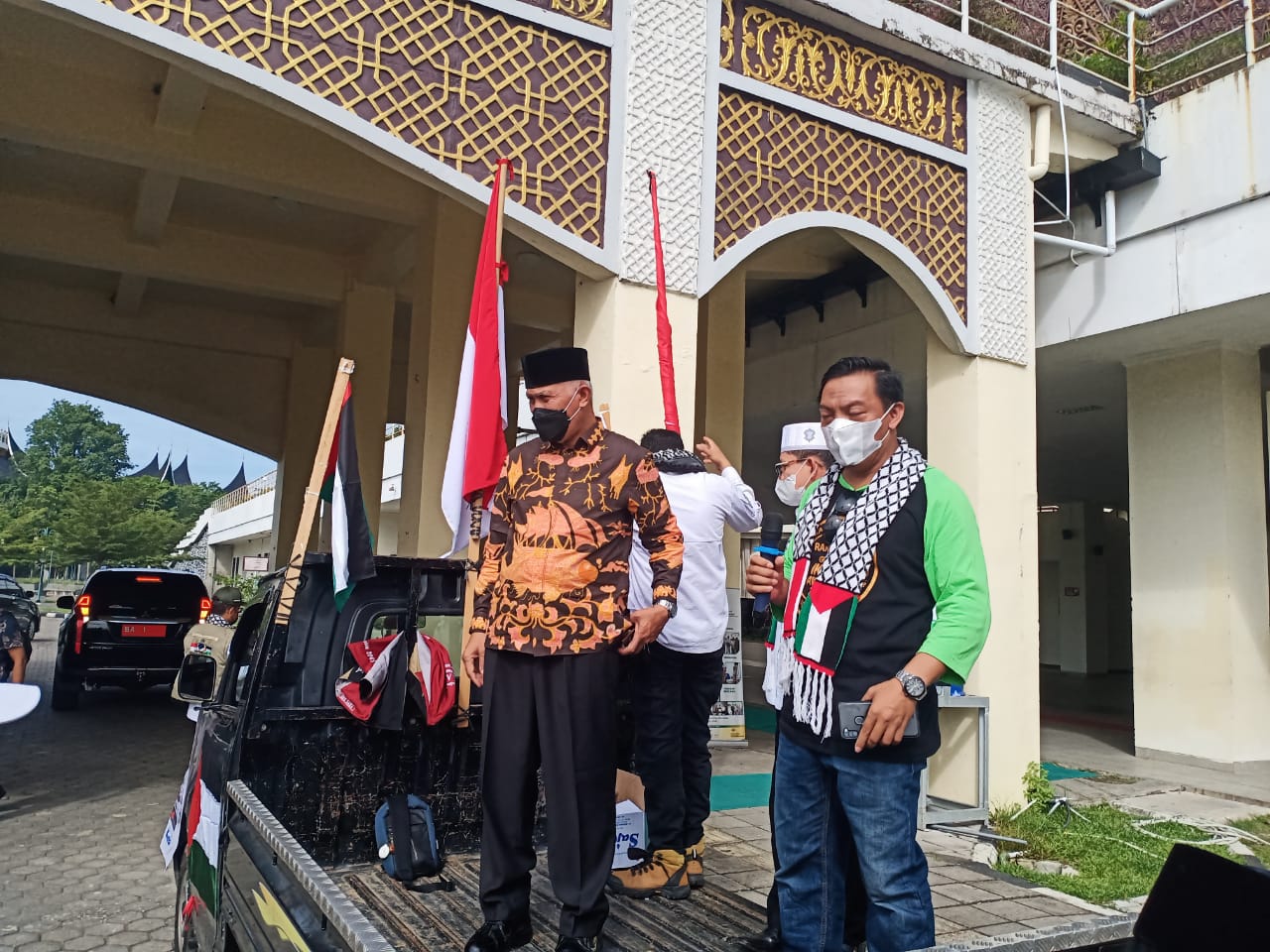 Gubernur Sumbar Mahyeldi Ansharullah memberikan dukungan dengan mengibarkan bendera Indonesia dan Palestina sekaligus melepas ratusan peserta aksi solidaritas Palestina, di halaman masjid Raya Sumatera Barat, Minggu (22/5).