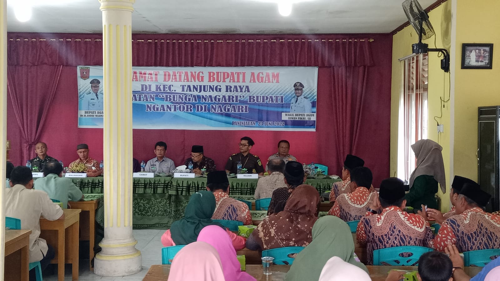 Paninjauan, siberindo.co — Bupati Agam Dr Andri Warman kembali melakukan kunjungan kerja ke nagari-nagari untuk bersilaturahmi dengan masyarakat sekitar. Kunjungan itu disebut dengan program Bunga Nagari atau Bupati Ngantor di Nagari. Kali ini, bupati bersama rombongan kepala OPD mengunjungi Nagari Paninjauan, Kecamatan Tanjung Raya, Kamis (23/6). Kedatangan kepala daerah dan sejumlah kepala dinas itu disambut antusias oleh para Walinagari se- Kecamatan Tanjung Raya, Forkopimca, Bamus, KAN, tokoh masyarakat, dan tamu undangan lainnya. Walinagari Paninjauan, Tomi Candra Putra mengaku bangga atas kedatangan Bupati Agam bersama rombongan dengan program Bunga Nagari yang dipusatkan di Nagari Paninjauan. “Atas nama pemerintah nagari kami mengucapkan terimakasih atas kedatangan pak bupati bersama rombongan yang hadir di Nagari Paninjauan. Semoga kegiatan Bunga Nagari ini bisa bermanfaat terutama dalam menampung aspirasi-aspirasi masyarakat,” katanya.