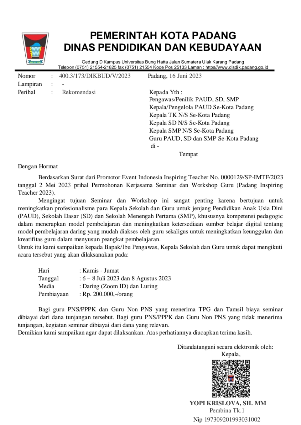 Padang, Siberindo- Para guru SD dan SMP se kota Padang jadi bingung dengan pernyataan Kepala Dinas Pendidikan Kota Padang Yopi Krislova bahwa tidak ada paksaan alias wajib untuk mengikuti seminar dan workshop berbayar sementara dalam surat rekomendasinya meminta semua guru mengikuti dengan wajib membayar Rp 200 ribu perorang.