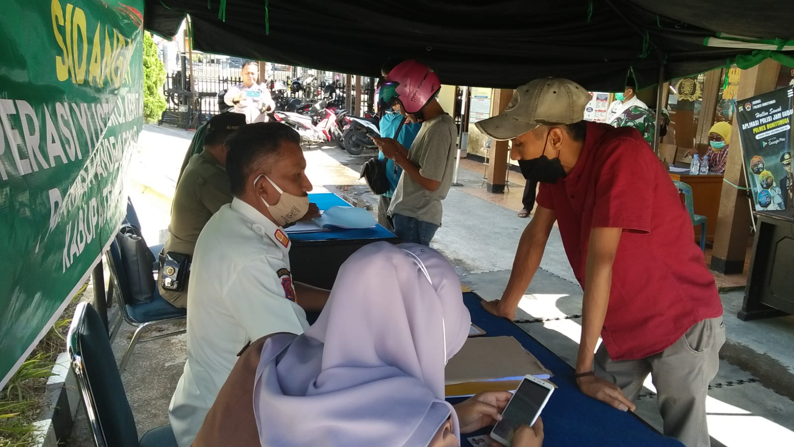 LUBUK BASUNG, Siberindo-Masih belum menyadari, begitu ganasnya dampak virus corona yang menjalar kedalam tubuh, buktinya operasi yustisi di Kecamatan IV Koto, Kabupaten Agam, Sumatera Barat, Jumat (23/7/2021) berhasil menjaring 26 pelanggar prokes tidak memakai masker keluar darai rumah karena ada sesuatu ursan. Dari 26 yang terjaring razia itu, 15 orang diantaranya dijatuhi sanksi sosial, 11 orang dijatuhi sanksi administrasi.