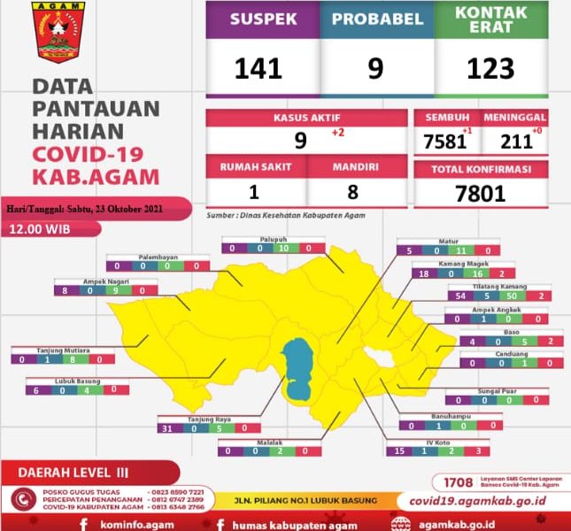 Sabtu ini, tercatat 2 penambahan kasus terkonfirmasi positif baru yang berasal dari kecamatan Tilatang Kamang dengan 1 penambahan pasien sembuh dari kecamatan Kamang Magek, sehingga total kasus aktif di kabupaten Agam kembali naik 1 poin, yakni 9 kasus dibanding dua hari terakhir.