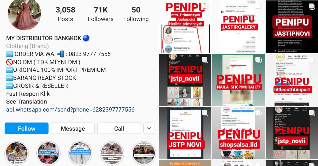 Akun instagram dengan nama My Distributor Bangkok (@my_distributor_bangkok) tidak kunjung mengirimkan barang pesanan berupa pakaian kepada mereka. Kontak whatsApp sebagai jalur komunikasi yang digunakan pun ikut diblok.