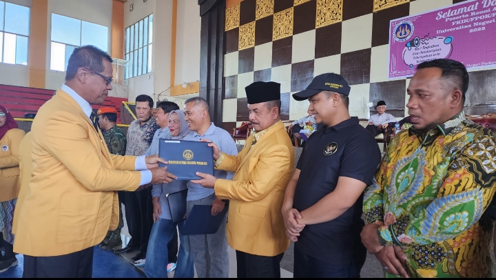 Ketua Umum LKAAM Sumbar Dr H Fauzi Bahar, M.Si Datuak Nan Sati, yang juga Ketum Alumni Universitas Negeri Padang (UNP), menerima Penghargaan Pengabdian yang diserahkan dalam Reuni Akbar Fakultas Ilmu Keolahragaan (FIK) UNP, di Auditorium UNP, Sabtu (24/12/2022).