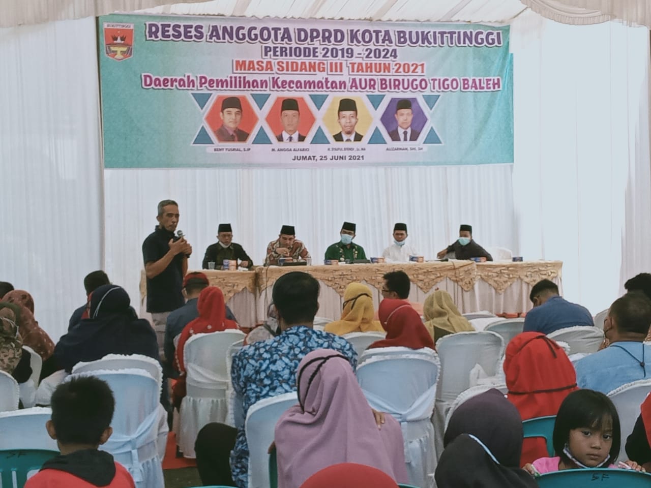 Bukittinggi, siberindo — Empat orang Anggota DPRD dari daerah pemilihan (dapil) Guguak Panjang, juga melaksanakan reses berkelompok. Reses dilaksanakan di halaman Kantor Camat ABTB, Jumat (25/06). Dalam reses itu, berbagai aspirasi muncul dari tengah masyarakat. Diantaranya terkait vaksinasi covid-19, yang tidak dapat mengantisipasi penyebaran covid. Virus ini juga berdampak pada proses pembelajaran. Dimana hal ini sangat mengganggu pendidikan anak anak penerus bangsa. Selain itu, juga disampaikan aspirasi mengenai permintaan penerangan jalan dan perbaikan jalan dan penertiban penggunaan bangku pariwisata.