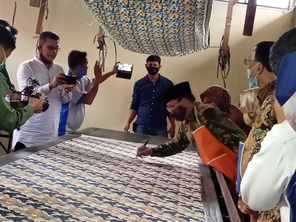 Menteri Desa PPDT RI, Abdul Halim Iskandar, dengan didampingi istri, Ny Lilik Umi Nasriah, serta Bupati Pesisir Selatan, Sumatera Barat, sengaja membubuhkan tanda tangan pada kain batik yang sedang dalam proses printing.