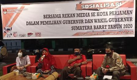 Demikian diungkapkan Komisiner Divisi Sosialisasi Komisi Pemilihan Umum (KPU) Kota Pariaman Abrar, Jumat (24/7/2020) malam pada sosialisasi bersama rekan media se-Kota Pariaman dalam pemilihan gubernur dan wakil gubernur Sumatera Barat tahun 2020 di salah satu café di Pariaman. Sosialiasi dibuka Ketua KPU Aisyah dengan menghadirkan narasumber lainnya Ketua Persatuan Wartawan Indonesia (PWI) Kota Pariaman/Kabupaten Padang Pariaman Ahmad Damanhuri Tuanku Mudo.