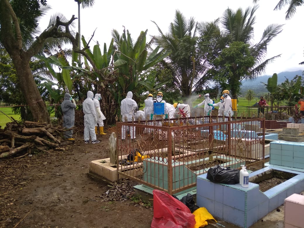 Pemakaman dilakukan dengan protokol kesehatan secara ketat. Sekitar pukul 11.00 WIB, prosesi pemakaman jenazah yang diawasi Satgas Covid-19, rampung.