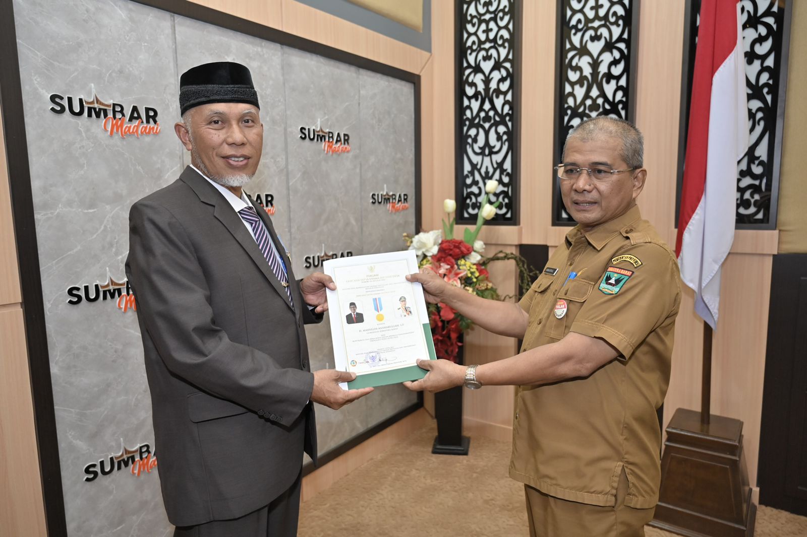 Kadis PMD Sumbar Amasrul Serahkan Piagam dan Lencana Satya Utama Inovasi Desa Kepada Gubernur Mahyeldi