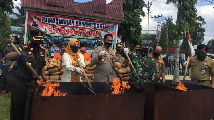 Kali ini sebanyak 104 kilogram daun ganja kering dimusnahkan. Pemusnahan ratusan kilogram ganja itu dipusatkan di halaman kantor kepolisian setempat, Selasa (25/8).