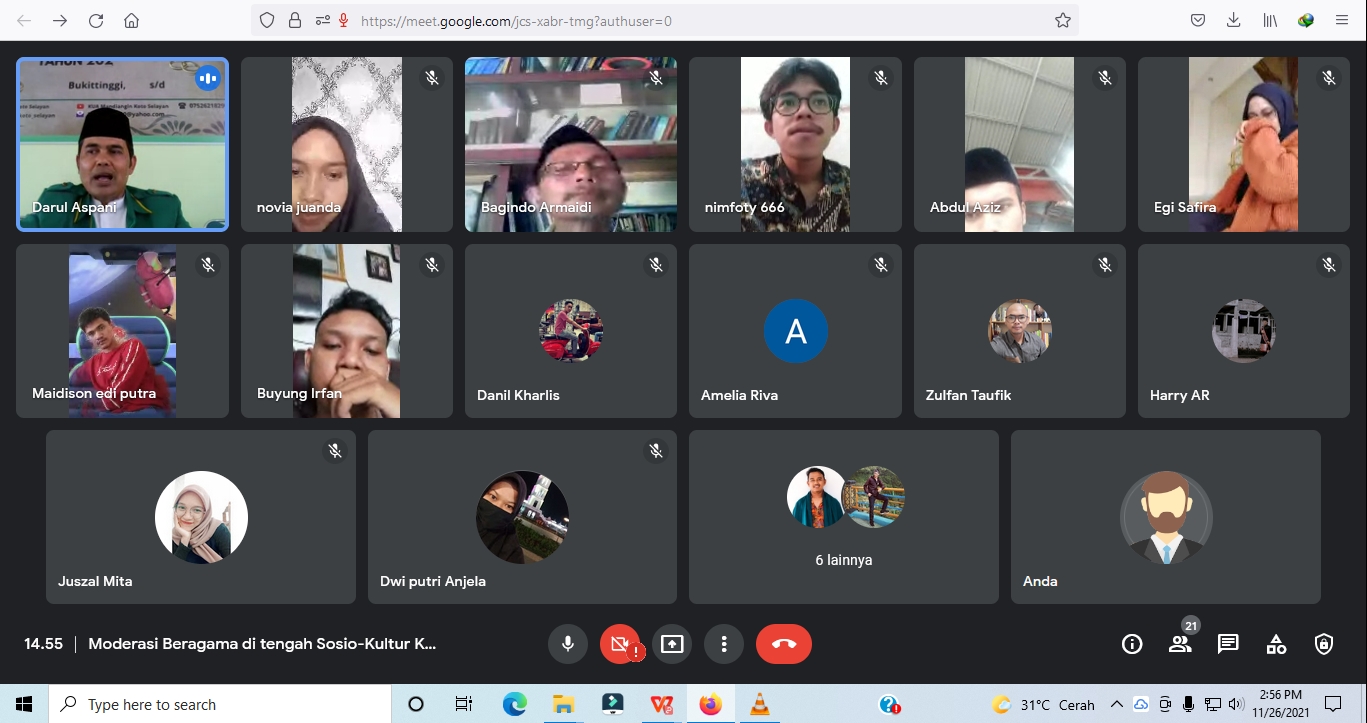 Demikian terungkap pada webinar  Moderasi Beragama secara virtual  yang diadakan  Pengurus Cabang Pergerakan Mahasiswa Islam Indonesia  (PC PMII) Kota Bukittinggi, dalam rangka memperingati Hari Toleransi Internasional dengan tema Moderasi beragama di Tengah Sosio-Kultur Kota Bukittinggi, Jumat (26/11/21).  Webinar dipandu  Ketua Umum PC PMII Kota Bukittinggi, Novia Yulanda dengan narasumber dari  Penyuluh Agama Islam Kemenag  Kota Bukittinggi Darul Aspani, S.Ag, M.H, Dosen Filsafat Institut Agama Islam Kota Bukittinggi, Dr. Zulfan Taufik, Wartawan utama Armaidi Tanjung, S.Sos, M.A, dan Pengurus Wilayah Gerakan Pemuda Ansor (GP Ansor) Zeki Aliwardana, S.Pd.I, M.M yang berhalangan hadir.