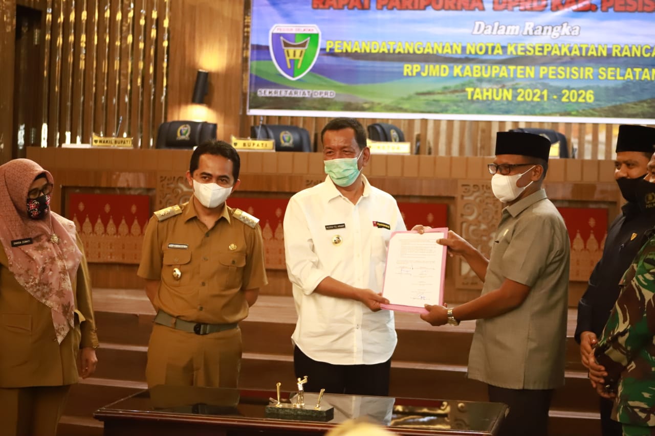 Nota kesepakatan rancangan awal RPJMD tersebut ditandatangani oleh Bupati Rusma Yul Anwar, dan Ketua DPRD, Ermizen, bersama wakil wakil ketua, dalam rapat yang dipimpin Wakil Ketua DPRD Aprial Habbas, serta dihadiri Wakil Bupati Rudi Hariyansyah, Pj. Sekda Emirda Ziswati, anggota Forkopimda, pejabat eselon II dan III lingkup Pemerintah Pesisir Selatan.