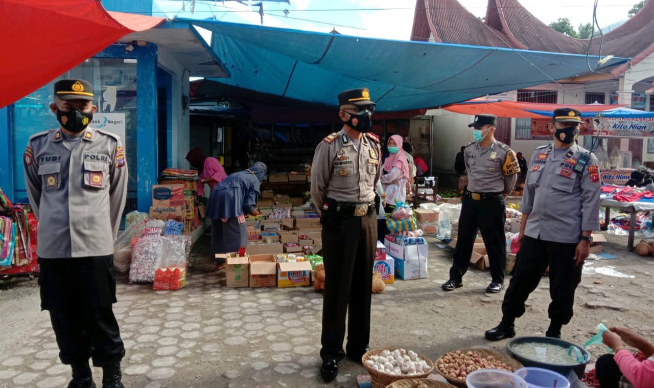 Seperti Selasa (27/4), sejumlah personil Polsek Tanjung Raya melakukan giat patroli di Pasar Maninjau, Kecamatan Tanjung Raya, Kabupaten Agam. Pada kesempatan itu, petugas kepolisian yang dipimpin Kapolsek Tanjung Raya AKP Yudi Partanto menyisir areal Pasar Maninjau untuk mengingatkan para pedagang dan pengunjung pasar agar tetap disiplin menjalankan protokol kesehatan sebagai upaya pencegahan penularan Covid-19.