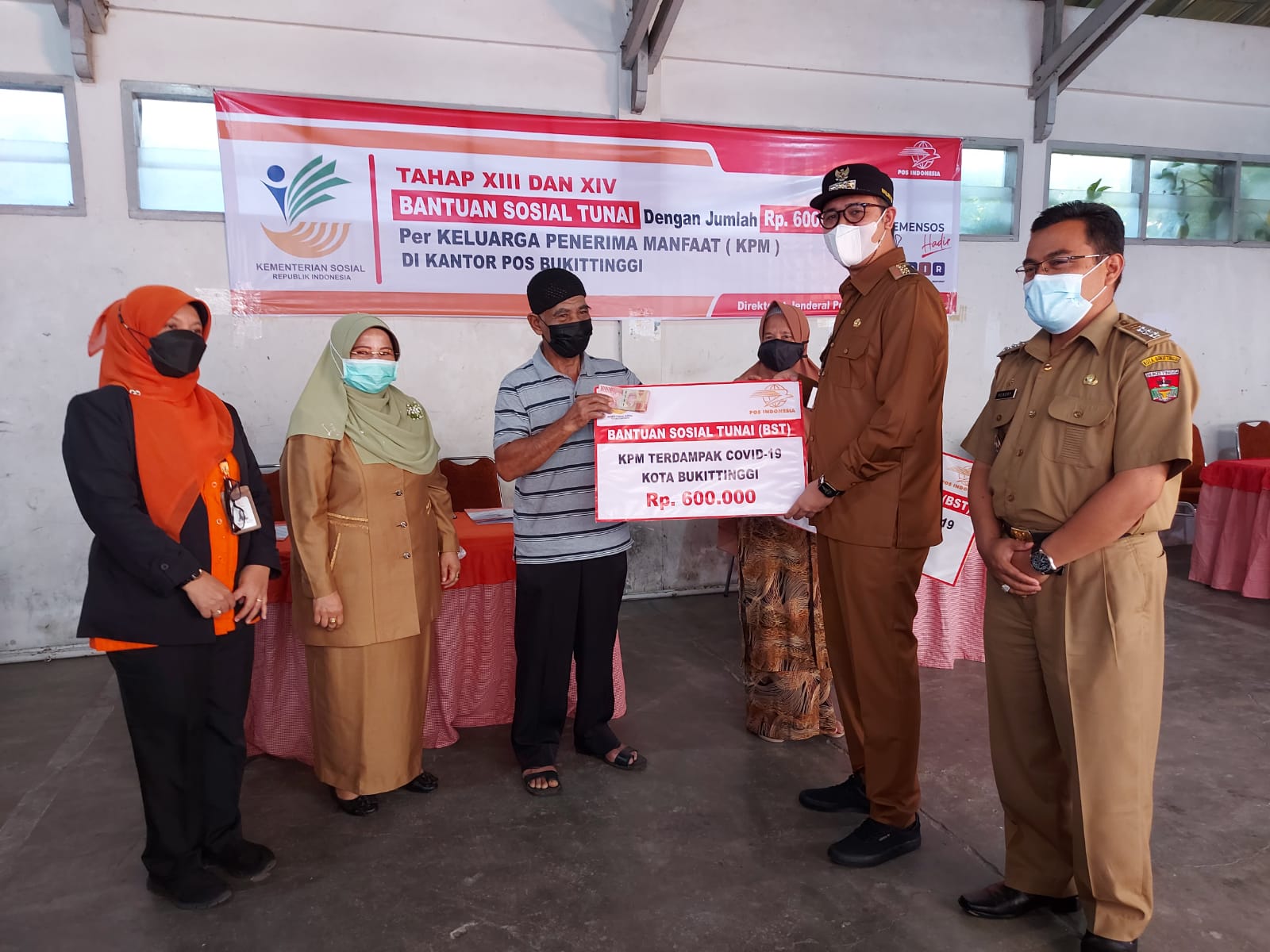 Kepala Dinas Sosial Bukittinggi, Linda Faroza, bersama Kepala Kantor Pos Bukittinggi, Laksmina Murni, menjelaskan, Bantuan Sosial tunai (BST) dampak Covid-19 kali ini, merupakan bantuan untuk tahap XIII dan XIV Kemensos tahun 2021. Total penerima BST di Bukittinggi sebanyak 2085 Keluarga Penerima Manfaat (KPM), dengan jumlah bantuan Rp 300 ribu per tahap per KPM.