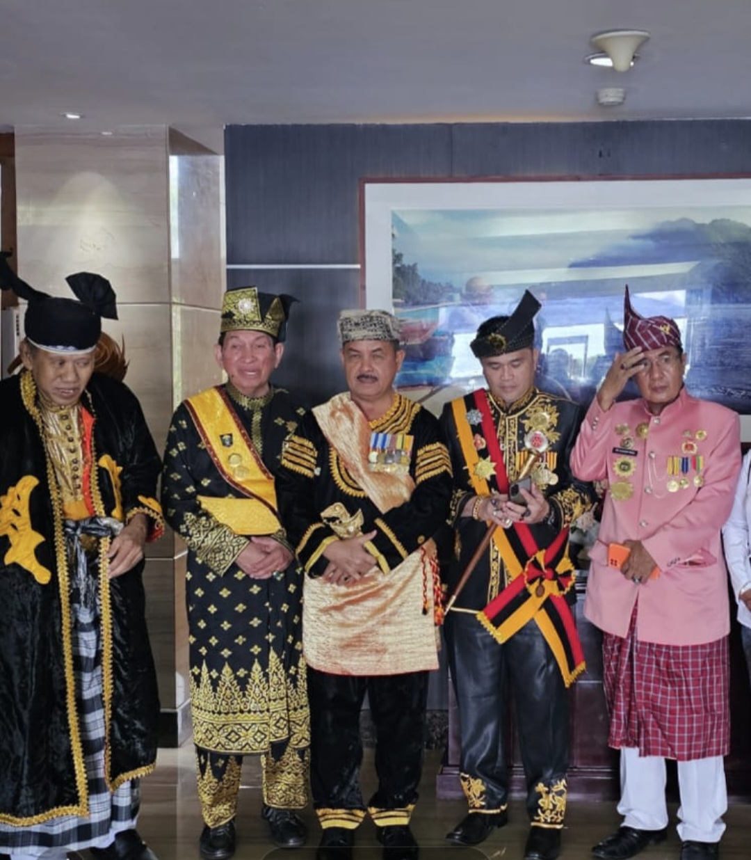 Dari Sumatera Barat hadir langsung Ketum Lembaga Kerapatan Adat Alam Minangkabau (LKAAM) Sumbar Prof. Dr. Fauzi Bahar, M.Si Dt. Sati, yang datang dengan pakaian kebesaran penghulu Minangkabau, lengkap dengan saluak dan keris.