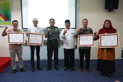 Untuk Piagam Penghargaan dan Terima Kasih diberikan kepada stakeholder yang konsisten mendukung Program TMMD Sumbar yaitu PT. Semen Padang, Perum Bulog, PT Pegadaian Wilayah Sumbar, Bank Nagari dan Baznas Provinsi Sumbar. (PB)