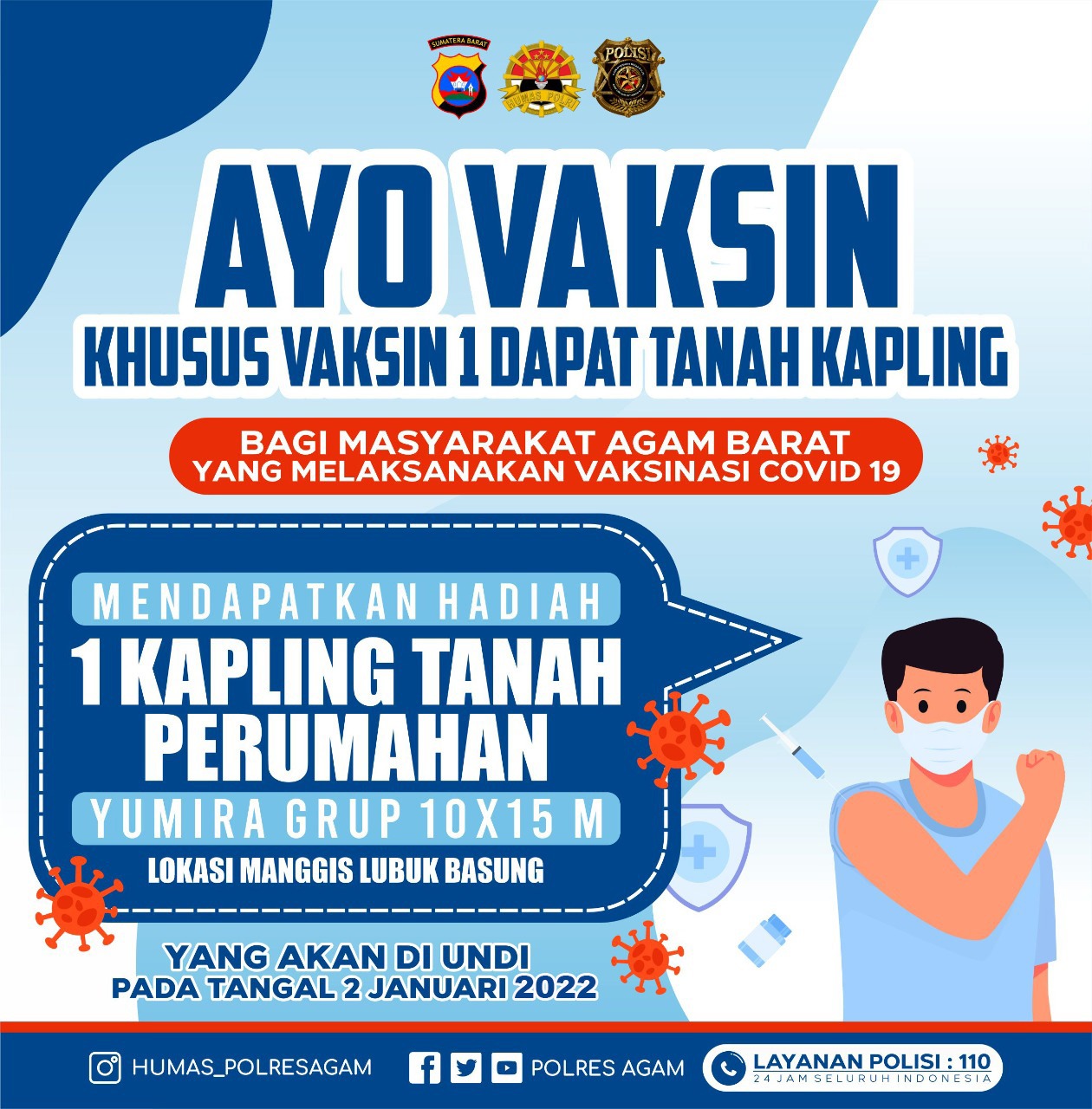 Lubukbasung, Siberindo.co — Pacu tercapainya target 70 persen kegiatan vaksinasi Covid-19 di wilayah hukum Polres Agam berbagai upaya makin gencar dilakukan. Salah satu upaya mendorong peran aktif masyarakat dalam kegiatan vaksinasi, Polres Agam menyiapkan hadiah undian berupa tanah kapling ukuran 10×15 meter. Undian berhadiah kaplingan tanah itu merupakan kerjasama dengan salah satu pengembang di kawasan Manggih, Nagari Lubukbasung, kecamatan Lubukbasung yang akan diundi tanggal 2 Januari 2022 mendatang. Peserta undian merupakan warga yang mengikuti vaksinasi Covid-19 khusus untuk penyuntikan pertama (V1) mulai tanggal 23-31 Desember 2021 dimana bukti keikutsertaan dalam vaksinasi paling lambat harus diserahkan tanggal 1 Januari 2022.