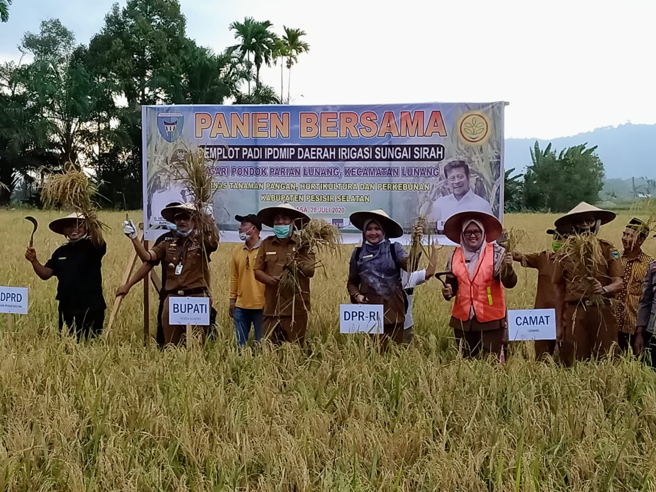 Bupati Pesisir Selatan, Sumatera Barat, Hendrajoni mengatakan pada panen bersama di Demplot Padi IPDMIP (Integrated Participatory Developmentand Management of Irrigation Program) Daerah Irigasi Sungai Sirah, Bukit Tapus, Nagari Pondok Parian Lunang, Kecamatan Lunang, Selasa (28/7).