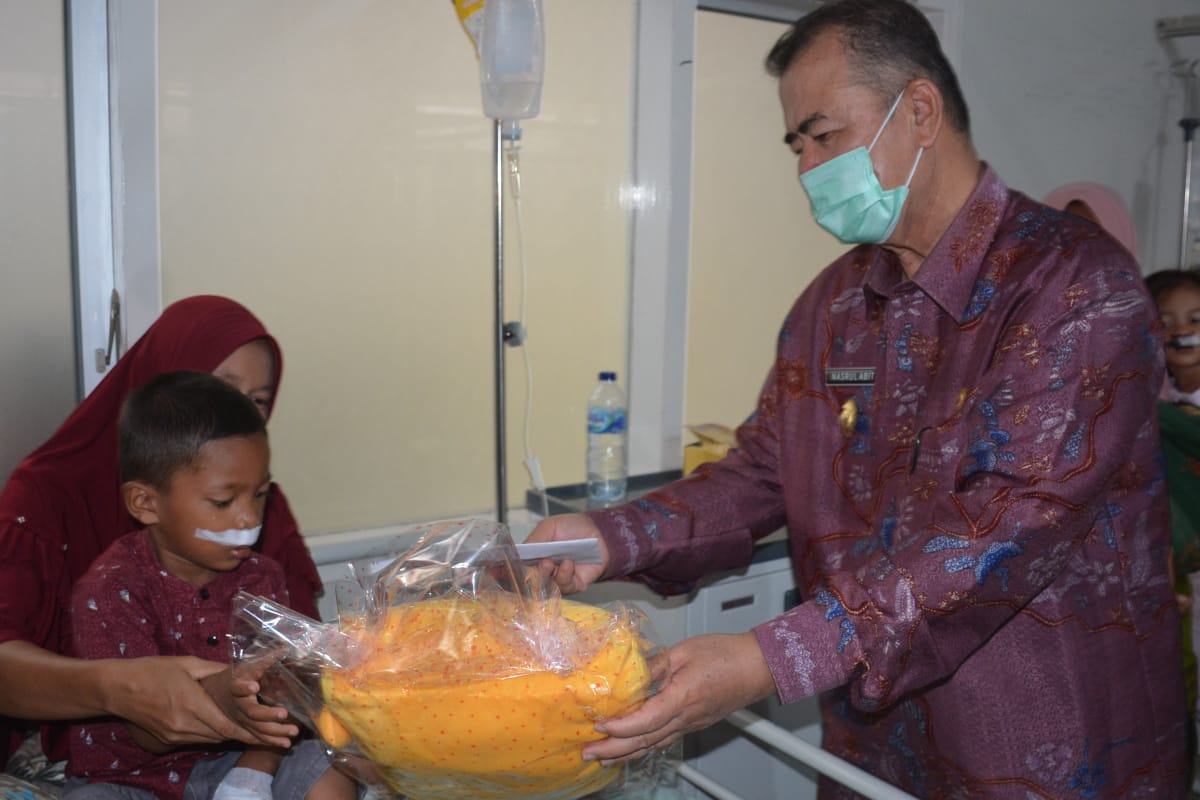 Untuk memotivasi semangat Wakil Gubernur Nasrul Abit juga memberikan boneka kepada pasien Bibir Sumbing tersenyum sembringah dioperasi tersenyum seperti anak lainnya.