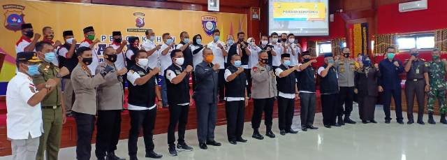 Dikatakan, bersama-sama TNI dan Polri jadilah garda terdepan dalam pendisiplinan social selama masa adaptasi kebiasaan baru. Pegang tekuh selalu slogan Pokdar Kamtibmas, “Elok-elok sajo.”