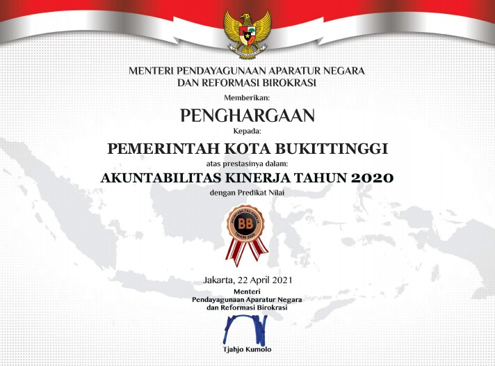 Bukittinggi, KABA12.com — Pemerintah Kota Bukittinggi berhasil mempertahankan nilai BB untuk Sistem Akuntabilitas Kinerja Instansi Pemerintah (SAKIP) dan nilai B untuk Pelaksanaan Reformasi Birokrasi tahun 2020. Hasil itu diumumkan pada acara penyerahan hasil Evaluasi Akuntabilitas Kinerja Pemerintah dan hasil Evaluasi Pelaksanaan Reformasi Birokrasi pada Kamis (29/04) secara virtual dari Jakarta. Ini merupakan keberhasilan Pemko Bukittinggi mempertahankan nilai BB tersebut tiga tahun berturut-turut.
