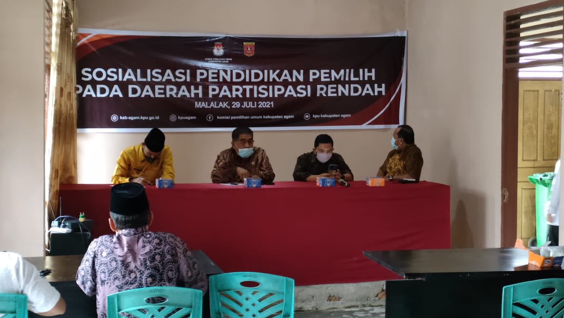 Salah satu wilayah yang partisipasi warganya rendah dalam pemilu di kabupaten Agam, adalah kecamatan Malalak, dimaan Kamis,(29/7) KPU Agam bersama Pemkab.Agam sengaja menggelar sosialisasi di aula kantor Camat Malalak.