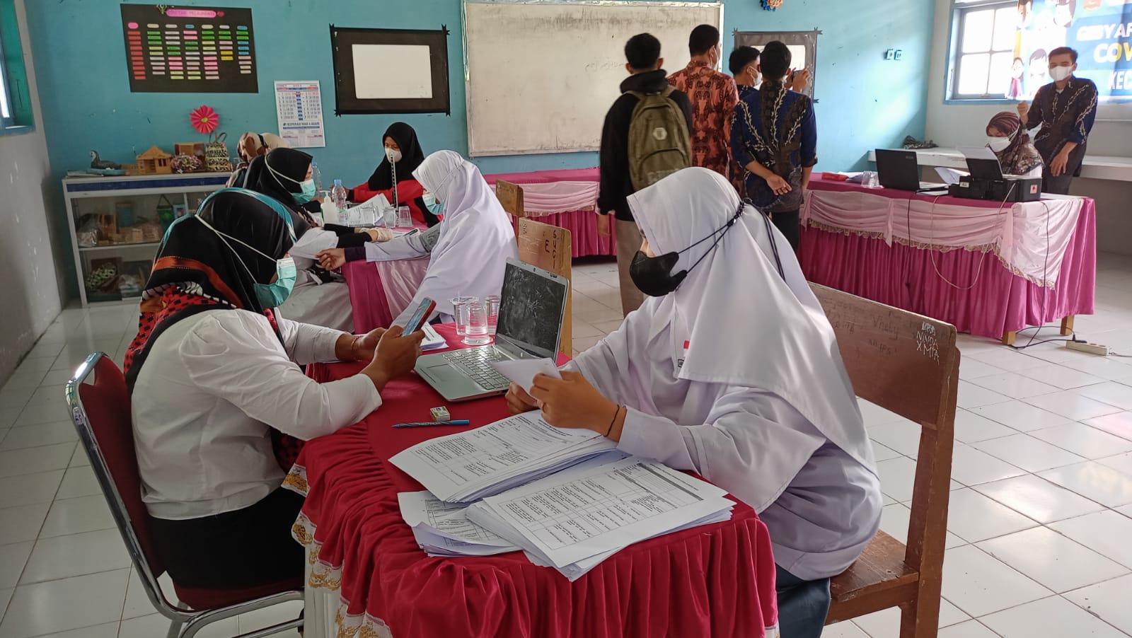 Pelaksanaan vaksinasi ini digelar di sekolah tersebut dengan menghadirkan pihak Puskesmas Pasar Ahad, Polsek Tanjung Raya, dan pemerintah kecamatan.
