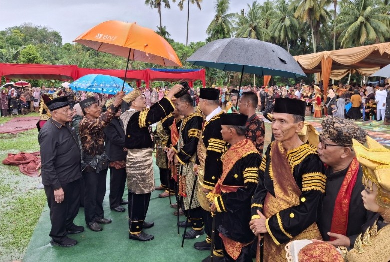 Delapan puluh orang pemangku gelar adat yaitu panghulu, wakil ninik mamak, imam dan khatib, dilewakan oleh Raja Adat Nagari Kambang Rahma Dianto Dt. Rajo Bagindo Sati dalam guyuran hujan lebat di Lapangan Sepakbola Kalumpang, Kambang, Kecamatan Lengayang, Kabupaten Pesisir Selatan, Minggu (28/9/2025) petang.