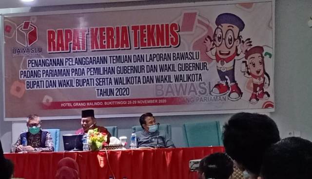 BUKITTINGGI, Siberindo.co – Badan Pengawasan Pemilu (Bawaslu) Kabupaten Padang Pariaman menggelar rapat kerja teknis (Rakernis) Sentra Penegakan Hukum Terpadu (Gakkumdu) terkait penanganan pelanggaran, temuan dan laporan bawaslu pada pemilihan Bupati dan Wakil Bupati Padang Pariaman, Gubernur dan Wakil Gubernur Sumbar 2020, Sabtu (28/11) di Bukittinggi.