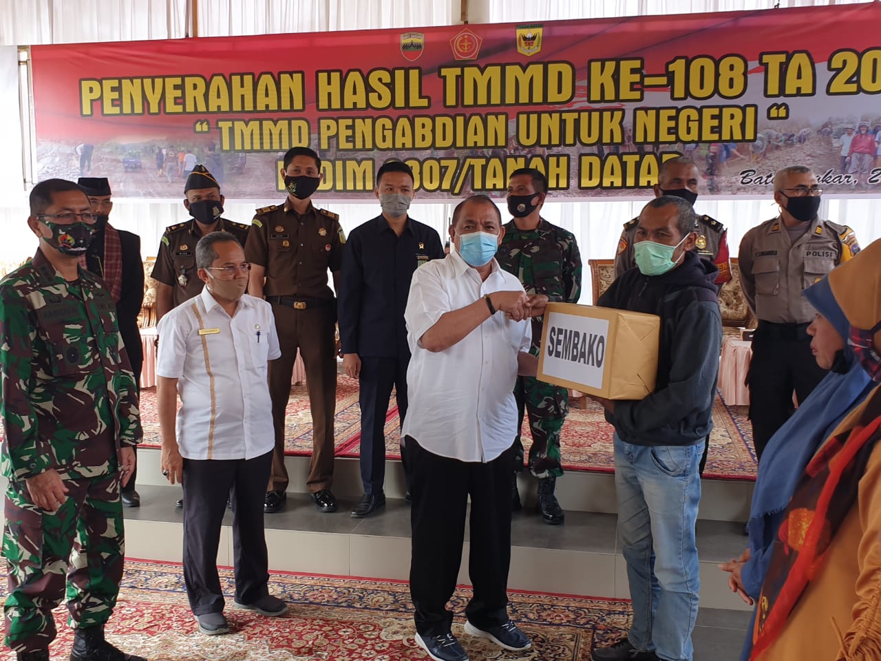 Pada kesempatan itu, diserahkan secara simbolis paket sembako untuk masyarakat, yang berasal dari Satgas TMMN ke-108/2020. Jumlah paket yang dibagikan berjumlah 1.000 buah yang isinya berupa sembako, diterima langsung oleh perwakilan masyarakat Nagari Panyalaian.