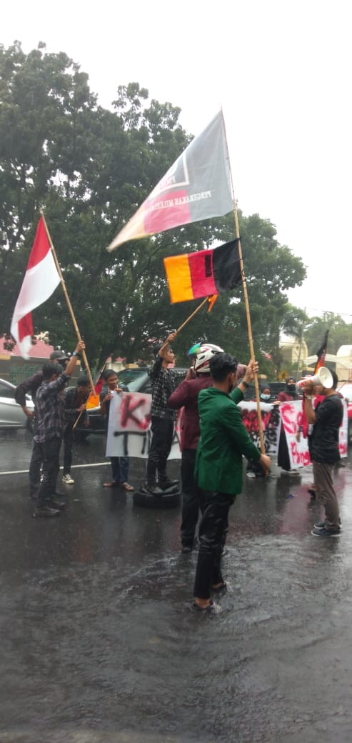 Dalam guyuran hujan yang lebat puluhan peserta aksi berorasi di halaman Mapolda Sumbar Jalan Sudirman Padang dengan tertib. Tidak berselang lama pihak kepolisian yang berpakaian preman tiba menorobos barisan mengambil atribut aksi, terjadi kericuhan para masa aksi dengan pihak kepolisian.