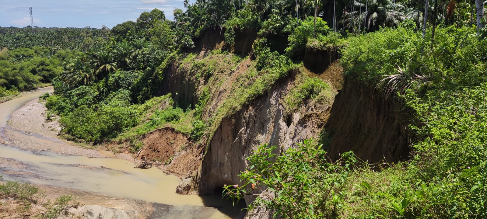 Dampak berubah arahnya aliran sungai akibat penumpukan material pasir, lumpur, bebatuan dan kayu yang dihanyutkan Banjir beberapa beberapa waktu lalu, mengikis bagian tepi tebing, yang berisi pemukiman penduduk, kompleks TPU, kebun warga dan ruas jalan utama di kawasan itu.
