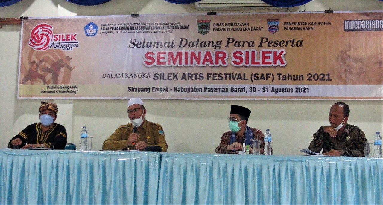 PASAMAN BARAT, Siberindo-Bupati Pasaman Barat (Pasbar) Hamsuardi membuka secara resmi Seminar Silek Arts Festival (SAF) tahun 2021 di aula Hotel Gucci, Senin (30/8/2021). Setelah membuka kegiatan, orang nomor satu di Kabupaten Pasbar tersebut langsung menjadi narasumber dengan memberikan materi kepada peserta seminar.