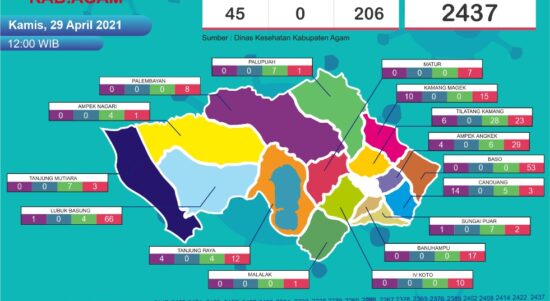 Lubukbasung, kaba12.com — Kabupaten Agam masih mengalami peningkatan kasus terkonfirmasi baru covid-19. Seperti halnya Kamis,(29/4) hari ini, terjadi penambahan 15 kasus terkonfirmasi